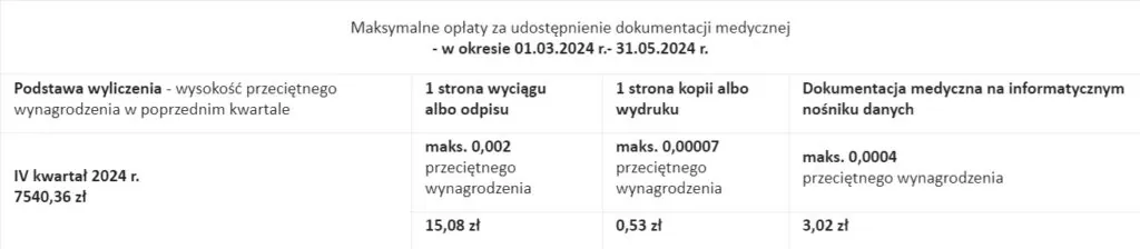 zgodnie z art. 28 ust. 4 ustawy o prawach pacjenta i Rzeczniku Praw Pacjenta, maksymalna wysokość opłaty za: